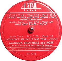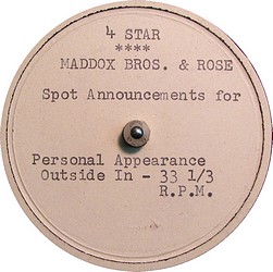 Song #1: I WANT TO LIVE AND LOVE AGAIN, Song #2: MILK COW BLUES Song #3: I CAN'T BELIEVE IT WAS TRUE 90 Second Ad, 75 Second Ad, 30 Second Ad #1, 30 Second Ad #2 MP-3 Matrix Number... Here is an early 10" 33 1/3 rpm LP with 4 radio ads, c.1949, from this estate. It was used to promote the bands tour and was sent to the different tour venues and local radio stations. Contains 4 radio ads for the Maddox Brothers and Rose, a very popular country-hillbilly group credited with 'creating' rockabilly style music in the mid-1950's, but this was earlier in their career than that, back when they were still with 4 STAR RECORDS. They moved to CAPITOL RECORDS in 1951. Anyway, the flip side of this record has 3 of the songs popular when this ad was promoted. Links to all the ads and songs are included above. Seems like the songs might have been played quite a bit over the years as the music side is worn and the ad side also shows wear and tear, though I don't think it was played too much. And, yes, the matrix number actually shows MP-3. Way ahead of it's time. |